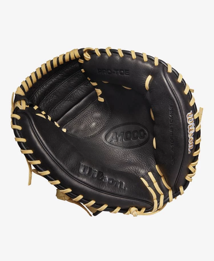 Frame every pitch on the black and block any ball in the dirt with the A1000® CM33 33” Catcher’s Mitt. A Half Moon Web allows for easy receiving and quick transfers, and the Black and Blonde Full Grain leather delivers durability and structure to set the target behind home plate.